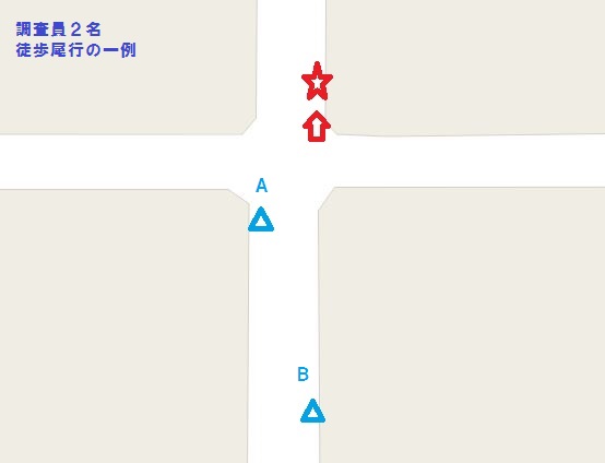 上の図は探偵調査員2名で調査対象者1名を尾行・追跡する一例です。